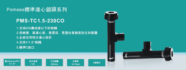 标准C接口同轴远心光学镜头PMS-TC1.5-230CO规格参数: