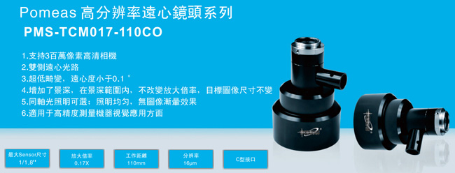 高分辨率同轴远心镜头PMS-TCM017-110CO规格参数: